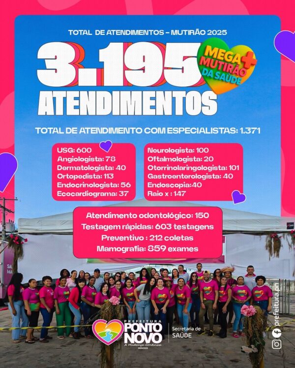 ByAgenciadcjunho 12, 2025A Prefeitura de Ponto Novo, por meio da Secretaria Municipal de Saúde, realizou com grande sucesso o Mega Mutirão da Saúde 2025, uma...