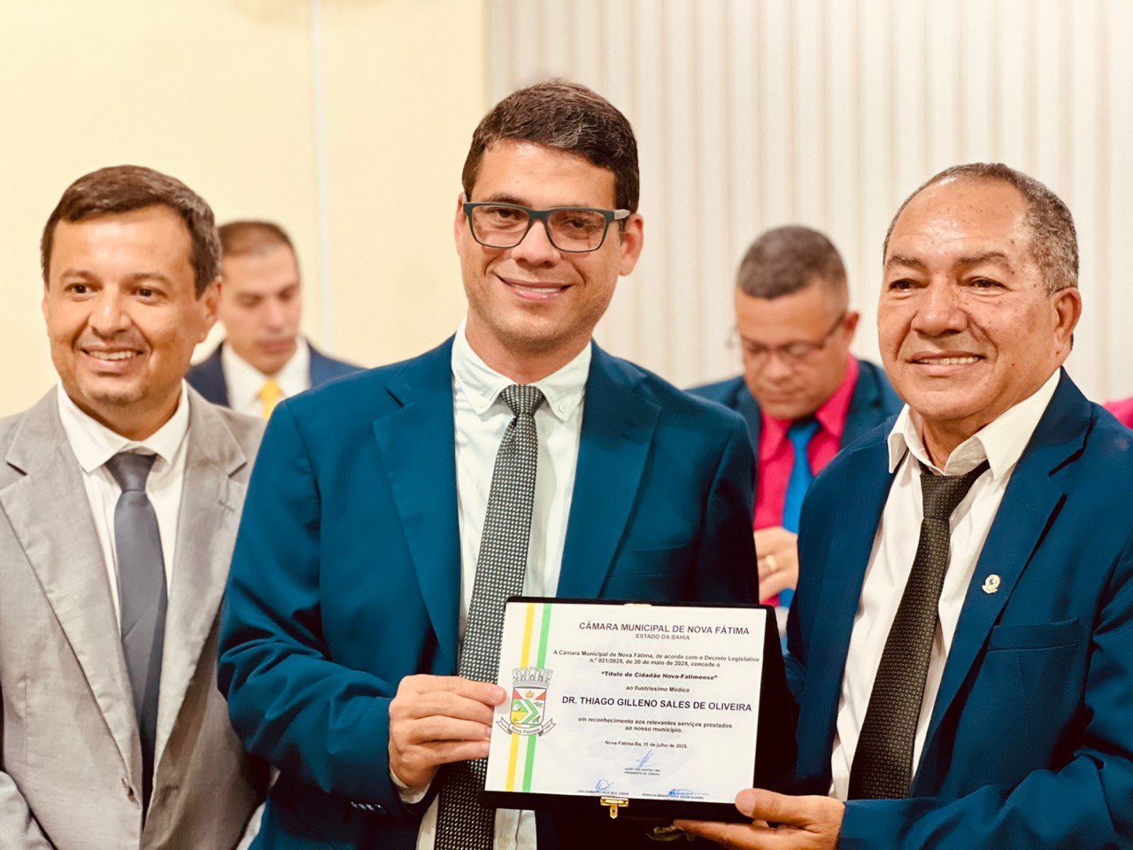 Reconhecido por sua atuação na área da saúde, Dr. Thiago prestou relevantes serviços à população do município, com destaque para os mais de 100 partos realizados ao longo de sua atuação profissional na cidade. Durante a cerimônia, vários vereadores ocuparam a tribuna para elogiar o trabalho do médico e agradecer pelo cuidado e dedicação dispensados às famílias novafatimenses.