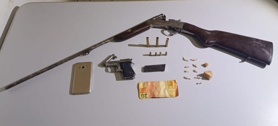 De acordo com informações, os militares abordaram o suspeito em um local apontado como ponto de comércio ilegal de drogas e durantes as buscas foi localizado uma pistola Beretta calibre 6.35 com capacidade para oito munições, uma espingarda cal.40, 04 munições cal 6.35, 03 cartuchos cal.40, uma pedra grande de 20g e 10 pedras pequenas de crack, um aparelho celular e R$ 20 em espécie.
