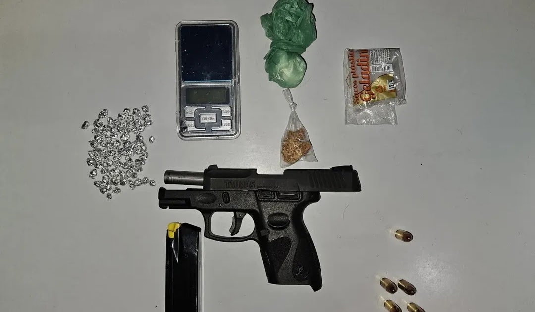 Em posse das informações, os policiais deslocaram até o referido ponto indicado, onde foi localizado escondido uma Pistola Taurus G2C 9mm, cinco munições intactas de igual calibre, um invólucro plástico com 11 gramas de um pó branco análogo a cocaína, 72 pedras e uma embalagem contendo 8 gramas de crack e uma balança de precisão.