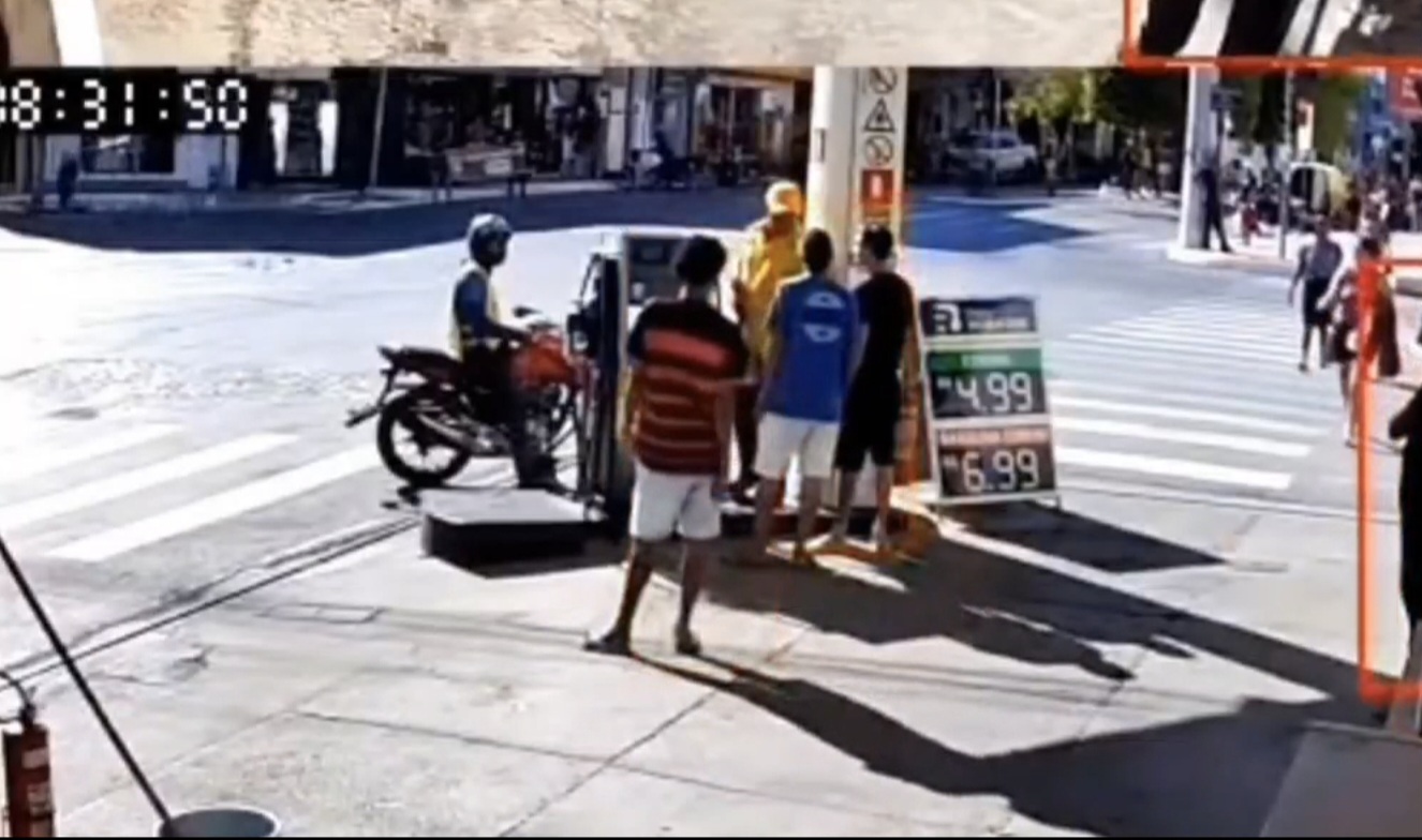 Imagens de câmeras de segurança flagraram o momento em que os agressores partiram pra cima do trabalhador, que estava abastecendo uma moto no momento da confusão.